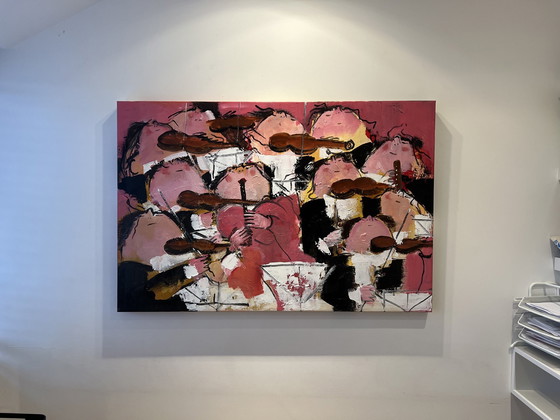 Particularly beautiful version of "The Orchestra." Large acrylic paint painting in shades of pink by the famous Gerdine Duijsens. Painting purchased at the Bijenkorf. Holland Art Galery. In excellent condition. Valuation 2023 by Noble House Valuation.