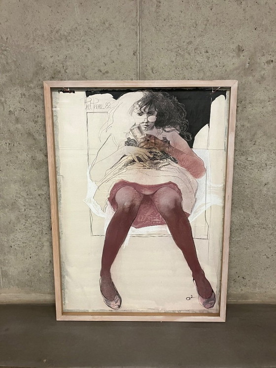 🇧🇪 "Linde" from Piet Peere's early period. The painting depicts a young woman reclining in a relaxed, almost nonchalant pose. She looks at us directly and intently. It feels as if you are observing a moment of private tranquility, without it becoming voyeuristic. Includes brochure of the exhibition at the 't Leerhuys gallery (figure drawings and etchings - 't Leerhuys gallery - October 8 to 31, 1982)