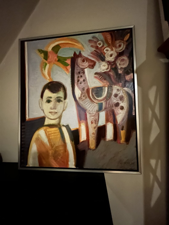This painting was created by Marcel Cockx, a student of Jan Cobbaert. It is Neo-Expressionist, and the image of the horse and child is typical of the artist. It is framed in a high-quality, recent frame and was originally purchased at the renowned Bernaerts Auction House in Antwerp.