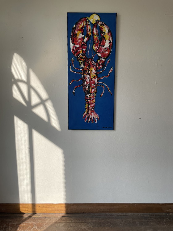 Painting of a lobster. 'It's my lemon' Painted in the summer of 2022 Painted by Britt Kleiberg 1980, Amersfoort Atelier based in Harderwijk Britt paints animals from all over the world with a story. This painting was made fairly recently in 2021 - She earned a degree in Graphic Design and Styling before finding her calling in contemporary art. Born into a family with a healthy interest in art, she was exposed to art at an early age and began painting when she was 10 years old. She loved going to museums and is grateful for the early education she received. It has given her the background for her current journey as a contemporary artist. Positivity, colors and freedom to roam The use of color is an important part of her artistic vocabulary: "Colors make people happy, and I like to bring joy and positivity into the world. Her palette can represent an animal's natural environment, hunting or an emotion; depending on what she wants to communicate. And however subdued, the background is part of it. She uses peculiar small shapes of color to 'fill' her animals. 'These represent imaginary continents,' she explains, 'and can represent the areas where the animal belongs, or where it wants to be. In my artistic world, anything is possible. My animals can roam freely.'