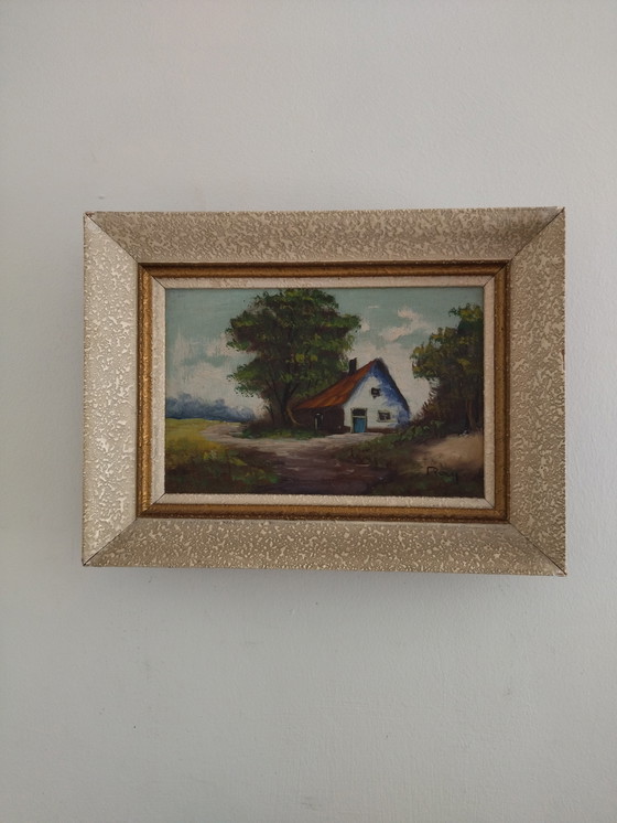 Discover this captivating painting of a pastoral landscape, a work of art that evokes the serenity and beauty of the countryside. Painted in oil on linen canvas, this piece depicts a picturesque cottage surrounded by majestic trees under a slightly cloudy sky. Signed by the artist "Ray," this painting embodies the figurative style typical of the mid- to late-20th century.