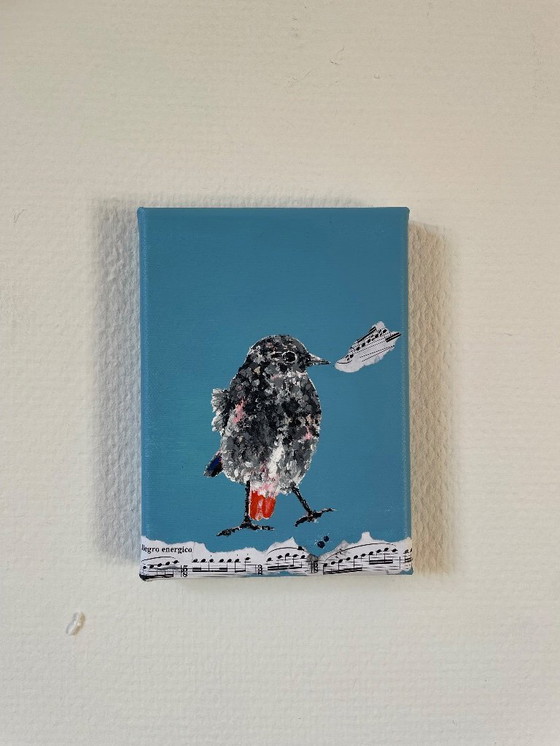 Title: 'Jumper Freedom!' Beautiful portrait of a young black redstart jumping on top of a branch of sheet music. The background color is a heavenly light blue. This painting was created in 2023 and is a continuation of the Dutch Birds series. Painted by Britt Kleiberg 1980, Amersfoort Atelier located in Harderwijk. Britt paints animals from all over the world with a story. During the corona period, they have put Dutch birds in the spotlight! - She completed a degree in Graphic Design and Styling before finding her calling in contemporary art. Born into a family with a healthy interest in art, she was exposed to art at an early age and started painting at the age of 10. She loved visiting museums and is grateful for the early training she received. It has given her the background for her current journey as a contemporary artist. Positivity, colors, and freedom to roam. The use of color is a key part of her artistic vocabulary: "Colors make people happy, and I want to bring joy and positivity into the world." Her palette can represent an animal's natural environment, hunting, or an emotion; depending on what she wants to communicate. And however subdued, the background is part of it. She uses curiously small color shapes to "fill" her animals. "These represent imaginary continents," she explains, "and can represent the areas where the animal belongs, or where it wants to be. In my artistic world, anything is possible. My animals can roam freely." More work: www.britt-art.nl. Current exhibition "HEAVENLY" on view in Harderwijk