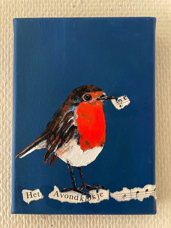Title: "The evening bell! Beautiful portrait of a robin on a branch of sheet music. The background color is a blue. This painting was made fairly recently in 2025. This portrait is a connection to the Dutch birds series. Painted by Britt Kleiberg 1980, Amersfoort Atelier based in Harderwijk. Britt paints animals from all over the world with a story. During the corona period she highlighted the Dutch birds! - She completed an education in Graphic Design and Styling before finding her calling in contemporary art. Born into a family with a healthy interest in art, she was exposed to art at an early age and began painting when she was 10 years old. She loved going to museums and is grateful for the early education she received. It has given her the background for her current journey as a contemporary artist. Positivity, colors and freedom to wander The use of color is an important part of her artistic vocabulary: "Colors make people happy and I like to bring joy and positivity into the world. Her palette can represent an animal's natural environment, hunting or an emotion; depending on what she wants to communicate. And no matter how subdued, the background is part of it. She uses curiously small color forms to "fill" her animals. 'These represent imaginary continents,' she explains, 'and can represent the areas where the animal belongs, or where it wants to be. In my artistic world, anything is possible. My animals can roam freely. More work: www.britt-art.nl