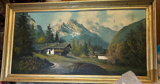 This framed painting shows a beautiful mountain landscape with traditional houses and lush nature. The colors are vibrant and the work is framed with a golden wooden frame that gives it a classic look. Perfect for lovers of traditional art and landscapes. Comes from household effects. Little further info available, is signed. 90x50cm