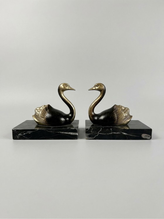 An elegant pair of bookends depicting two stylized swans, made in France in the Art Deco style of the 1930s.