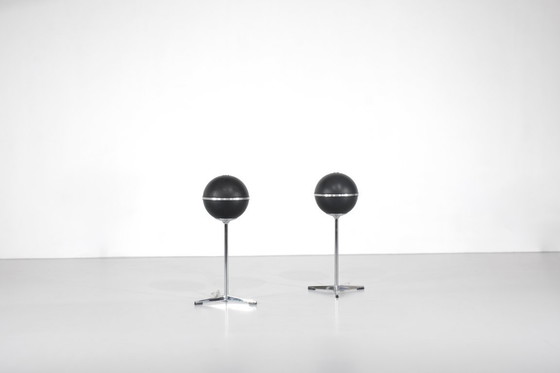 Pair of black "Audiorama 7000" spherical speakers on tripod stands.