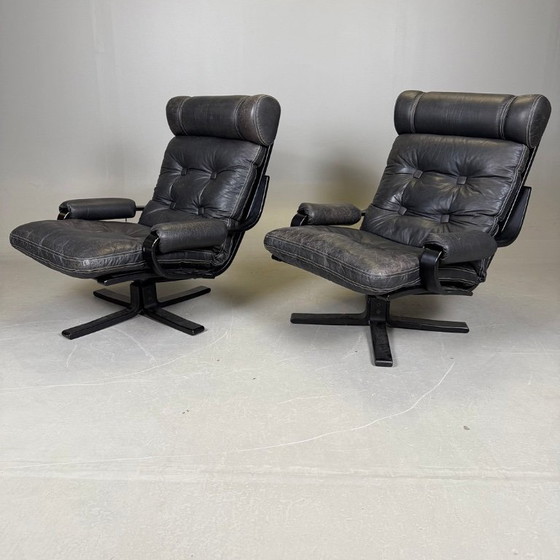 Step into the elegance of the Mid-Century Modern era with this exquisite pair of spinning armchairs. Crafted with a harmonious blend of black leather, metal, and wood, these chairs offer both style and functionality. The sleek design and comfortable seating make them a perfect addition to any sophisticated living space.