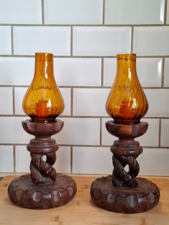 Pair of Brutalist style wooden candlesticks, Arts and Crafts. Height 28 cm, diameter 13 cm.