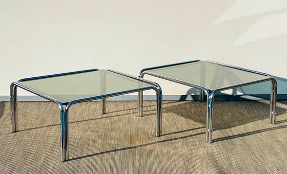 Chrome-plated tubular steel frame. Smoked gray glass top.