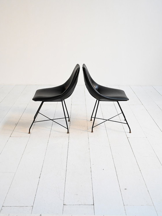 Pair of Cosmos model chairs attributed to Augusto Bozzi, produced in the 1950s–60s. The black vinyl seat is shaped into a continuous, enveloping form, defined by the central cut-out in the backrest which lightens the volume and gives the model its distinctive character. The structure features slender painted metal legs, connected by stretchers and finished with brass caps. The contrast between the smooth, compact surface of the vinyl and the light metal base results in a balanced and well-proportioned design.
