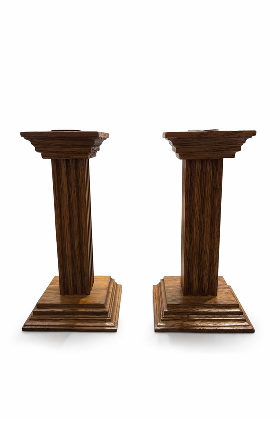 An elegant pair of solid oak candlesticks, produced by the historic Dutch manufacturer Meubelfabriek Oisterwijk around the 1960s. These pieces represent a perfect example of Northern European modernist design, where the quality of the material and the purity of the form are the protagonists. The silhouette is characterised by a fluted column resting on a solid stepped base, creating a geometric balance that recalls the lines of mid-century Scandinavian design. Unlike common wooden candlesticks, this pair is distinguished by the presence of the original manufacturer's fire mark on the base, an absolute guarantee of authenticity and high-quality craftsmanship. Technical Details: Manufacturer: Meubelfabriek Oisterwijk (fire mark present). Period: circa 1960. Style: Mid-Century Modern / Dutch Design. Material: Solid turned oak. Measurements: Height 18 cm | Base 9 x 9 cm | Standard candle hole (2 cm). Total weight: 419 g. Condition: In excellent vintage condition. The oak retains its beautiful natural grain and a warm patina acquired over time. Structurally perfect, solid, and ready to be incorporated into a contemporary decor or a vintage design collection.