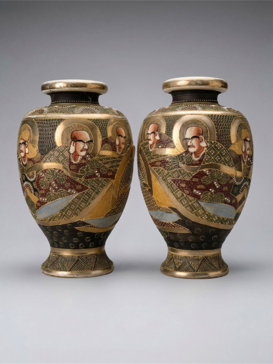 A superb pair of Satsuma-style Japanese ceramic vases, likely dating from the early 20th century, hand-decorated in the tradition of Japanese export workshops.