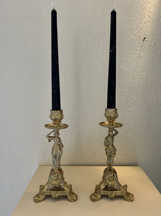 Pair of bronze candlesticks in the French Empire style, popular in the early 19th century (circa 1820-1840) during the reign of Napoleon Bonaparte.