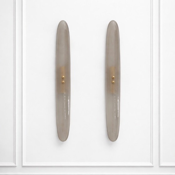 Wall light composed of an organic element in curved, smoky-colored, satin-finish Murano glass in the shape of a leaf, in the style of Fontana Arte. The elongated, concave part embraces the rectangular brass structure, lending movement to this sculptural piece. This lamp's shape makes it perfect for columns and hallways. Equipped with two G9 candle holders. Backplate dimensions: 14.5 x 2.5 cm. Multiple pairs available; please inquire for availability. We also sell in non-standard quantities; contact us for a quote. Additionally, upon request, our glassworks can produce larger quantities and in different colors to meet your specific needs.