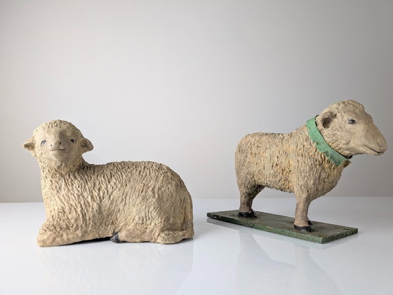 The standing sheep is secured to a simple wooden base, painted in a dark green hue, which provides structure and contrast. The reclining lamb is an unmounted, simpler form. Both figures possess an authentic aged patina, which enhances their vintage character and confirms their history. These sculptures function as versatile decorative accents, ideal for introducing a touch of pastoral charm to any setting. They are in good vintage condition, consistent with the age and inherent fragility of the material.