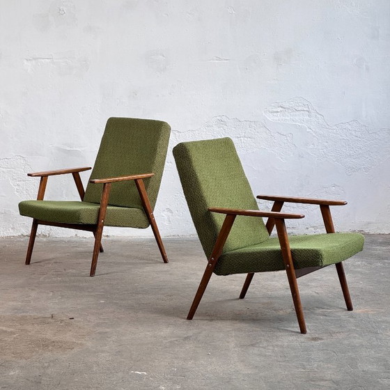 This elegant pair of armchairs was produced by the renowned Czechoslovakian manufacturer Tatra Nábytok during the 1960s. A staple of Mid-Century Modern design from the Eastern Bloc, these chairs feature the characteristic geometric wooden armrests and splayed legs that defined the era's functional yet sophisticated aesthetic.