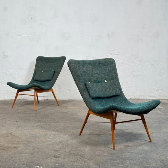 This pair of lounge chairs is a significant example of late 1950s Czechoslovakian design, created by the influential Miroslav Navrátil for Český Nábytek in 1959. These chairs are renowned for their ergonomic fiberglass shell construction, which paved the way for more organic, fluid furniture forms during the Mid-Century Modern era.