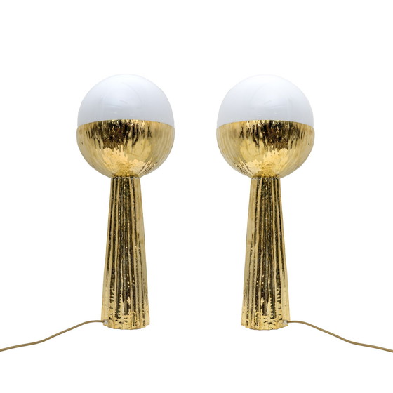 Special pair of lamps in hand-hammered brass sheet and opaline glass.