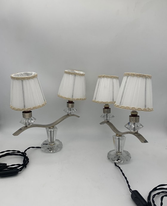 This pair of two-light table lamps features a symmetrical structure, featuring a base and decorative elements in clear faceted crystal, and brass arms. They date back to the 1930s. The glass was hand-molded. The electrical system is new and working, with an E14 lamp socket. The shades are new and spring-loaded onto the bulb.