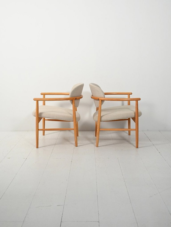 Pair of “Pluto” armchairs designed by Alf Svensson for Kovck Möbler, Malmö, produced in the late 1950s. The solid bent oak frame creates a soft, continuous profile, with integrated armrests set at a height of 57.5 cm and light proportions. The well-preserved cushions rest on a sprung seat that ensures comfort and support. Svensson, a key figure in Scandinavian modernism, expressed Nordic design through an elegant and functional language, aligned with Swedish mid-century production focused on organic lines and natural materials.