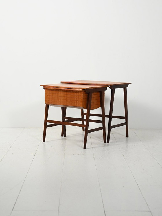 A pair of Scandinavian 1950s nesting coffee tables, designed to slide together naturally while keeping an airy, light presence. The frames are dark lacquered oak, paired with warm, even-toned mahogany tops. One table integrates a yarn-and-sewing container with a small drawer and thread compartments: the basket is made from thin wooden slats stitched together, an uncommon technique with a remarkably precise finish.