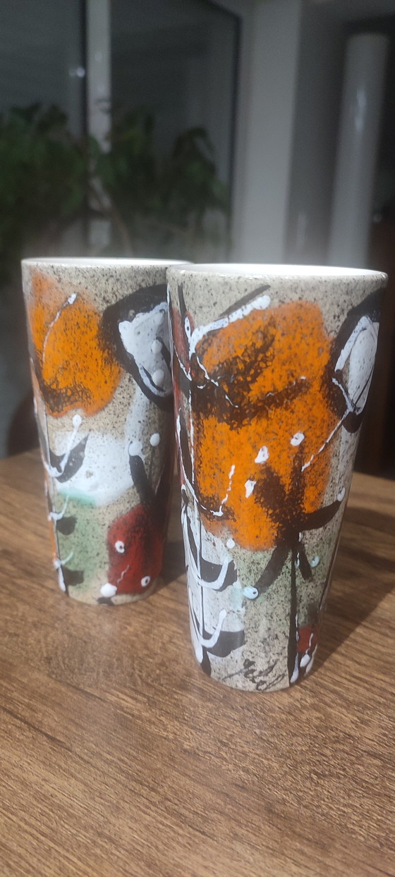 Two handcrafted mugs from the 1950s/60s, Vallauris-style ceramic, hand-painted with red, orange, brown, and black glazes, and speckled with white in relief. Each piece is unique.
