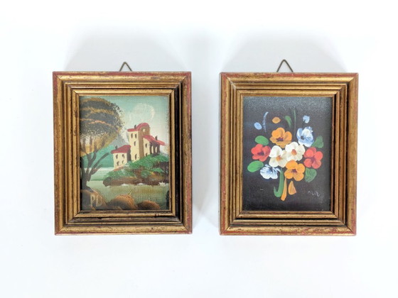 This charming pair of small Italian oil paintings includes one delicate floral composition and one serene landscape scene. Each artwork is artist signed and beautifully presented under glass in matching gilded wooden frames.