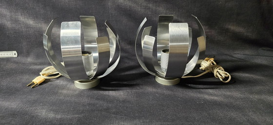 Pair of wall or table lamps in brushed metal, designed by Jocelyne Trocmé for the publisher Oxar, fleur de lumière" circa 1970.