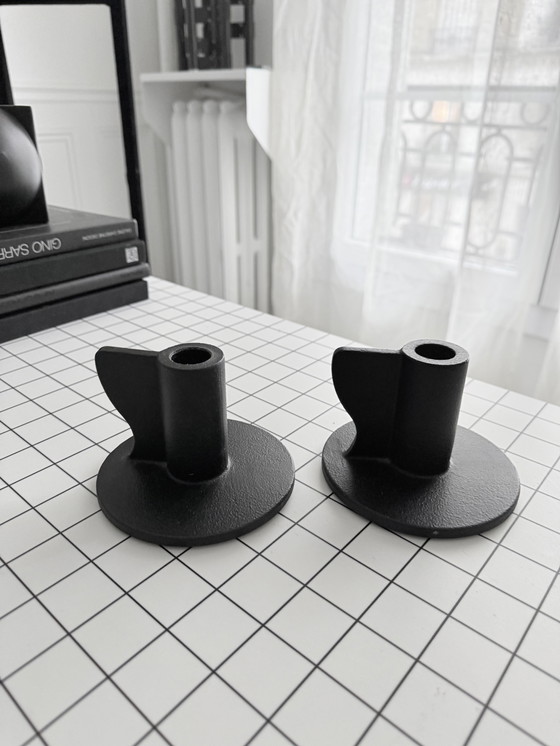 Pair of IKEA PS 1995 candlesticks by Thomas Eriksson in black metal.