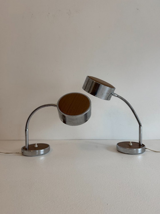 Pair of adjustable table lamps with a chrome-plated metal and wood frame, produced in France in the 1970s. Their rounded design reflects the style of the 1970s. A beautiful blend of materials is achieved through the use of wood and chrome-plated metal. They provide indirect and directional lighting.