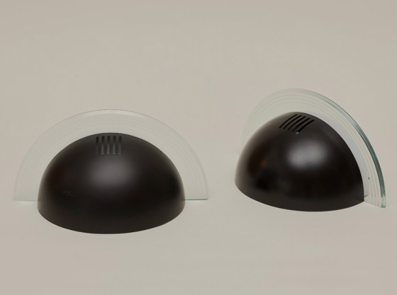 Discover this pair of half-moon wall sconces, a true embodiment of the 1980s Memphis postmodern style. These unique pieces, crafted from metal and Lucite, bring a touch of sophistication and originality to any interior.