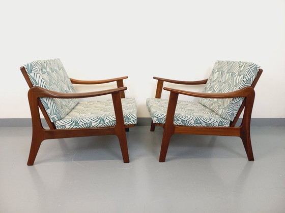 Suite of 2 vintage Scandinavian armchairs from the 60's, beautiful design by Danish designer Arne Wahl Iversen for Komfort, in teak, seats and backs with removable cushions in white fabric with duck blue patterns, very good overall condition.