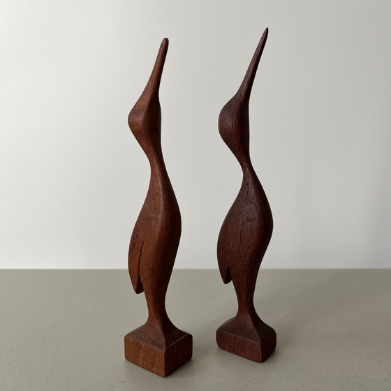 Elegant pair of hand-carved, solid teak birds from Sweden.