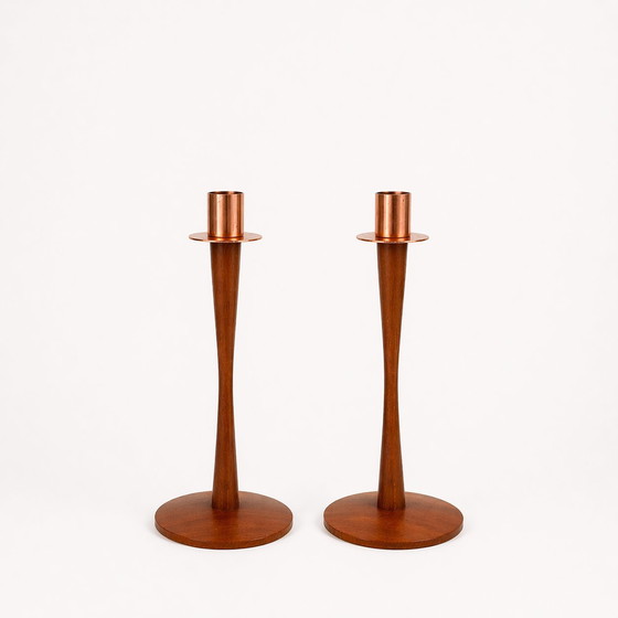 Pair of vintage Scandinavian teak and copper candlesticks, made in Sweden in the 1960s. These pieces feature clean lines and are highly representative of Nordic design from that period.