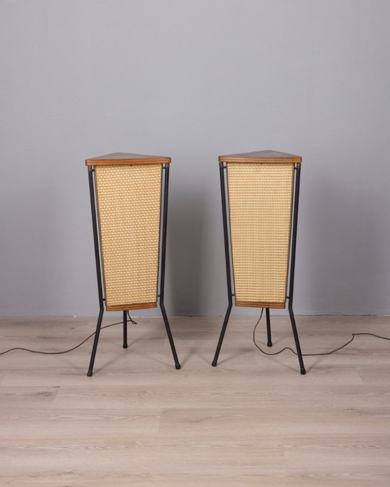 Pair of speakers, made of walnut wood, black metal with gold inserts and fabric, manufactured by Schaub Lorenz, Germany, 1960s.