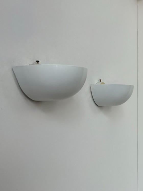 Pair of wall lights with a matte white lacquered metal frame, produced in Italy in the 1980s.
