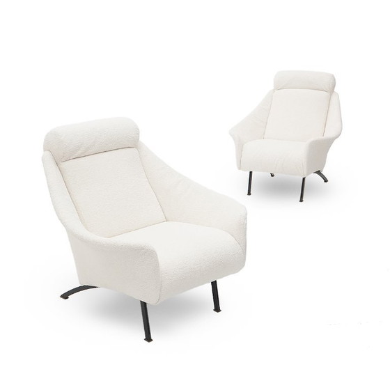 Pair of Italian armchairs from the 1950s, featuring fluid lines and an enveloping shape that combine elegance and comfort.