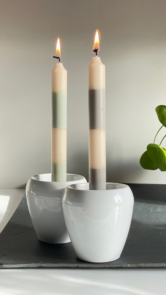 A lovely pair of white ceramic candlesticks, a chic and stylish set likely from the 2000s.