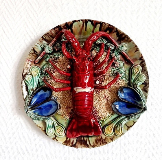 Immerse yourself in the vibrant and colorful world of Portuguese naturalist earthenware with this spectacular wall plate. At its center sits an impressive red lobster in relief, surrounded by seashells, stylized coral, and glazed seaweed, mimicking a beach in an explosion of textures and shimmering colors.