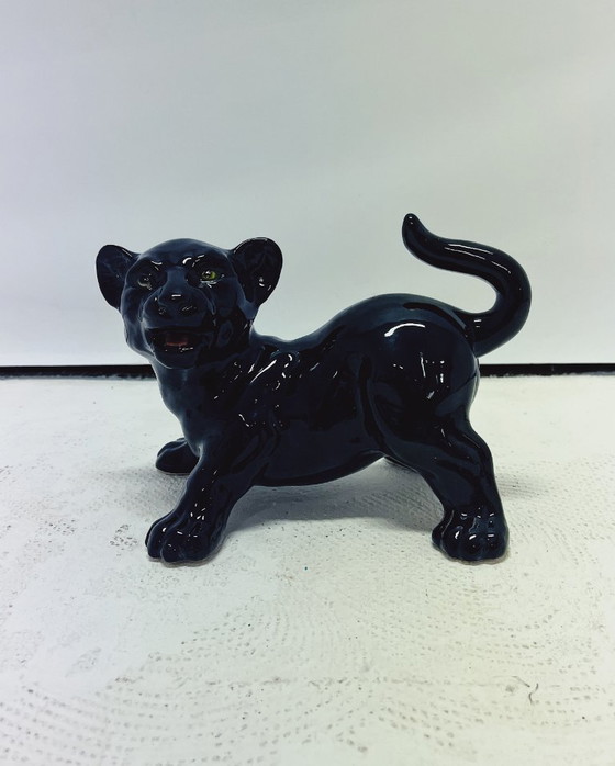 Unique handmade sculpture of a panther cub. This Hollywood Regency sculpture, crafted from hand-painted ceramic and made in Italy, will undoubtedly add a stunning and bold look to your interior!