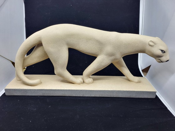 Discover this magnificent sculpture of a panther in crisp earthenware, an iconic Art Deco piece dating from 1935. Made in France, this artwork captures the elegance and power of the panther in a dynamic and graceful pose.