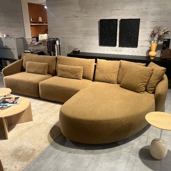 This Mostera design is ideal for those seeking a warm, contemporary sofa with a soft and inviting character. The combination of an armrest, an open seat, and the Lovely element creates a playful yet balanced lounge setup. The Felt Mustard fabric brings color and coziness to the interior without sacrificing elegance.