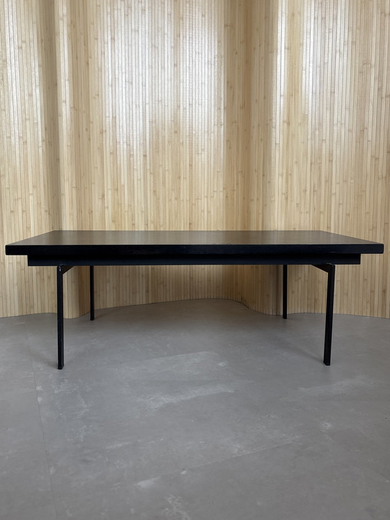 The tabletop is teak veneered and attached to the metal base, which is exactly the same as the cabinets from the same line. The top is black. Sleek and mounted in an almost floating manner. This vintage teak table features clean, straight lines, giving the table a timeless appearance.