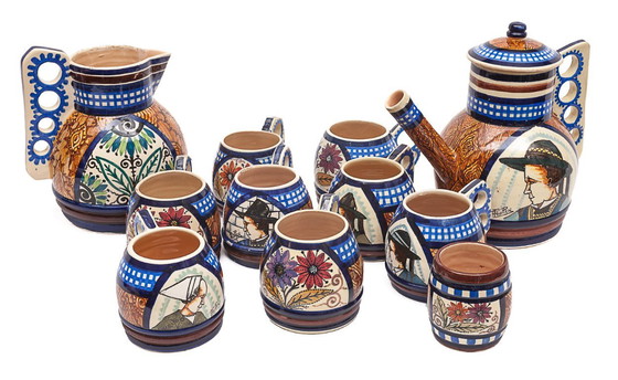 Paul Fouillen coffee set. Unusual. Quimper, Brittany, France. 1 coffee pot, 1 milk jug, 1 sugar bowl, 8 cups. Impressive and typical decorative work, handmade. Circa 1940