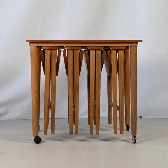 Mid-century British teak nest of tables designed by Paul Hundevad, consisting of one large coffee table on wheels with four smaller tables nested inside. Clean lines and classic 1960s design make this set both functional and stylish — perfect as a centerpiece or versatile living room solution.