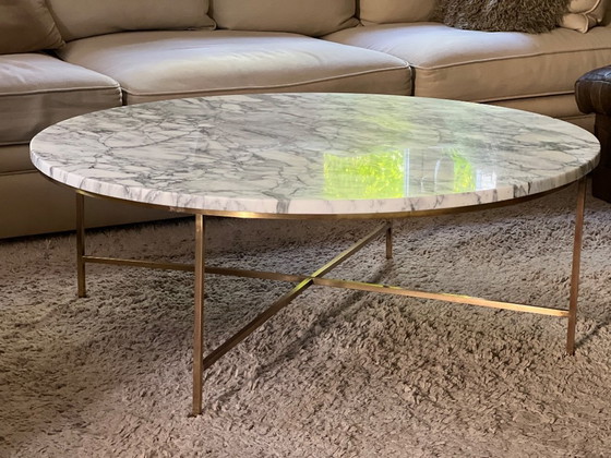 Round coffee table by Paul McCobb 1955, with a magnificent grey-veined white marble top, thickness 2 cm, no chips or cracks. Brass base. Very good condition.