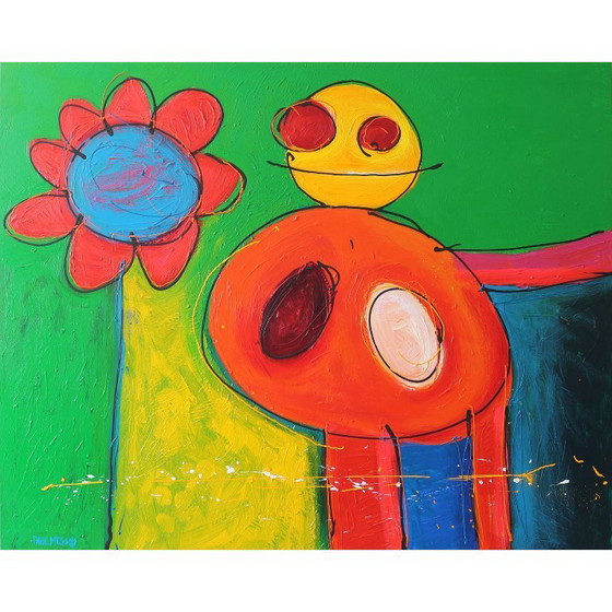 With its generous dimensions of 150 x 120 cm, this work, titled “Does a flower have a soul?” (2010), is an absolute masterpiece from his oeuvre. The cheerful, almost Cobra-like style with thick, impasto paint layers gives the canvas beautiful depth and texture.
