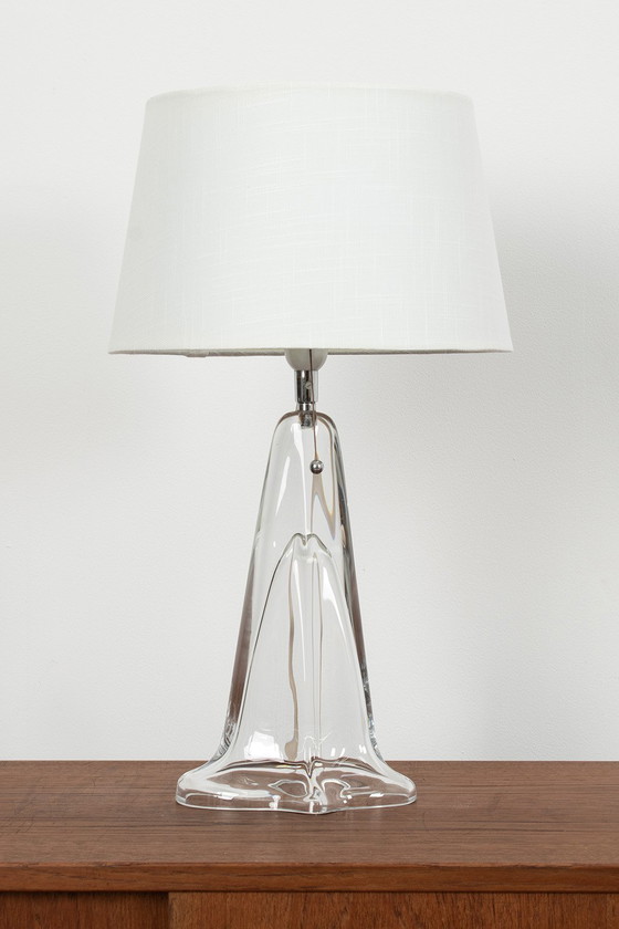 Peill & Putzer table lamp made of clear glass. The logo is etched into the glass. In good vintage condition.