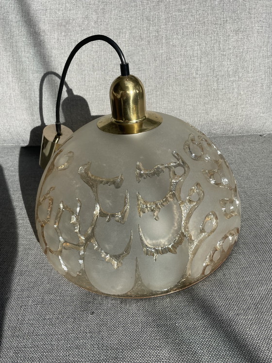 This exquisite Peill & Putzler pendant lamp from the 1970s embodies the elegance and craftsmanship of its era. The lamp features a beautifully textured glass shade that captures and diffuses light, creating a warm and inviting ambiance. The brass fittings add a touch of sophistication, enhancing its vintage charm.