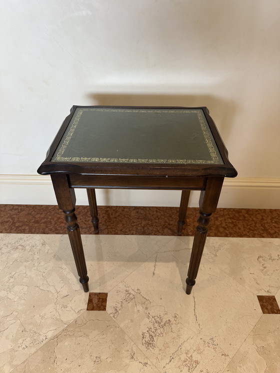 Step back in time with this charming petite vintage side table, crafted from rich wood and adorned with a unique green inlay. Its compact size makes it a versatile addition to any room, perfect for displaying a lamp or your favorite book.